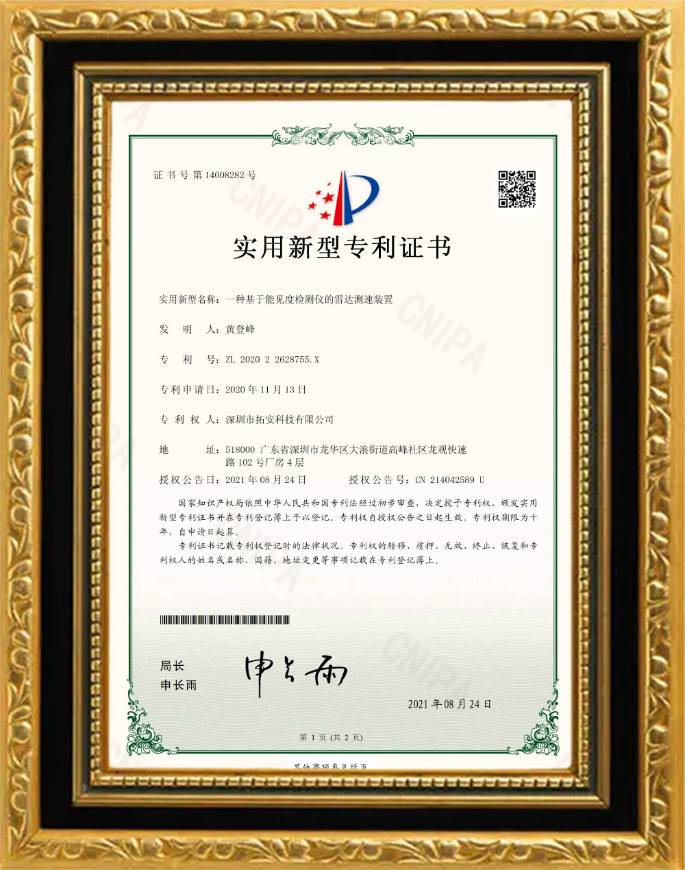 太陽能雷達專利證書