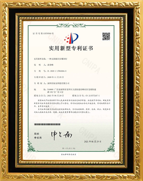 太陽能同步爆閃燈專利證書