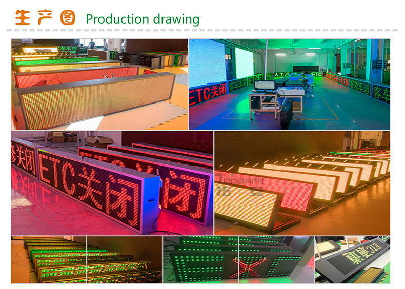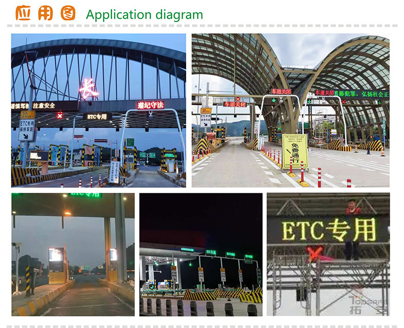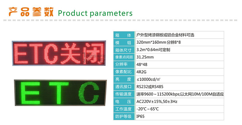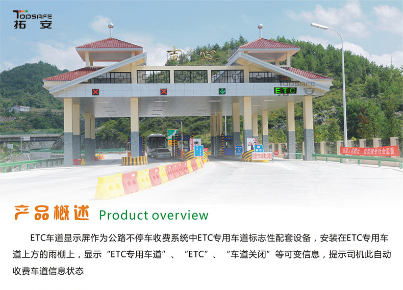 ETC車道顯示屏作為公路不停車收費(fèi)系統(tǒng)中ETC專用車道標(biāo)志性配套設(shè)備,安裝在ETC專用車道上方的雨棚上,顯示“ETC專用車道”、“ETC”、“車道關(guān)閉”等可變信息,提示司機(jī)此自動收費(fèi)車道信息狀態(tài)