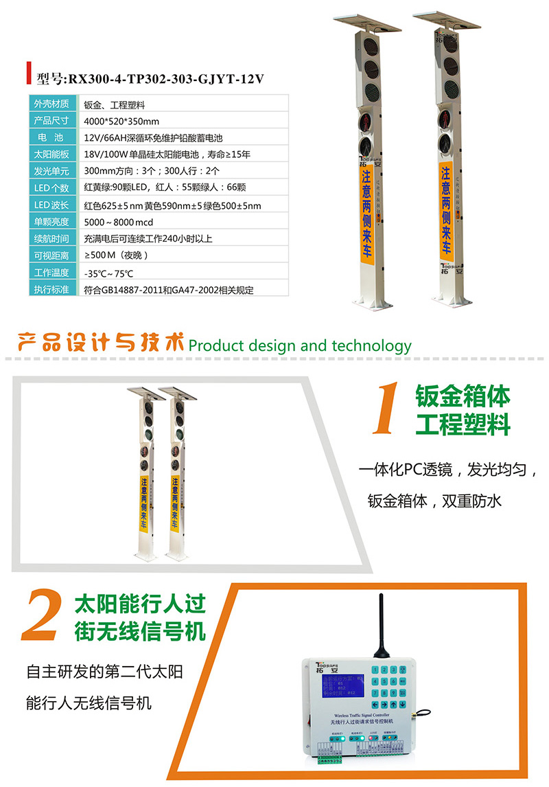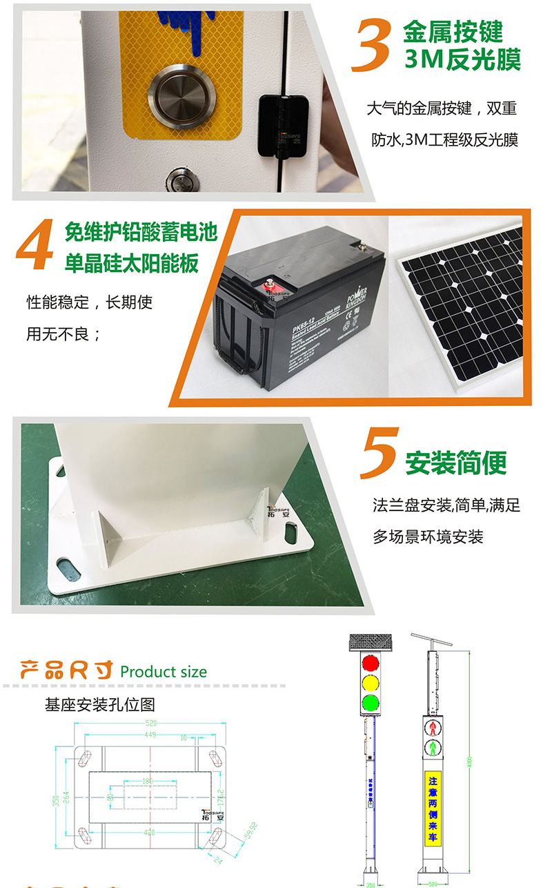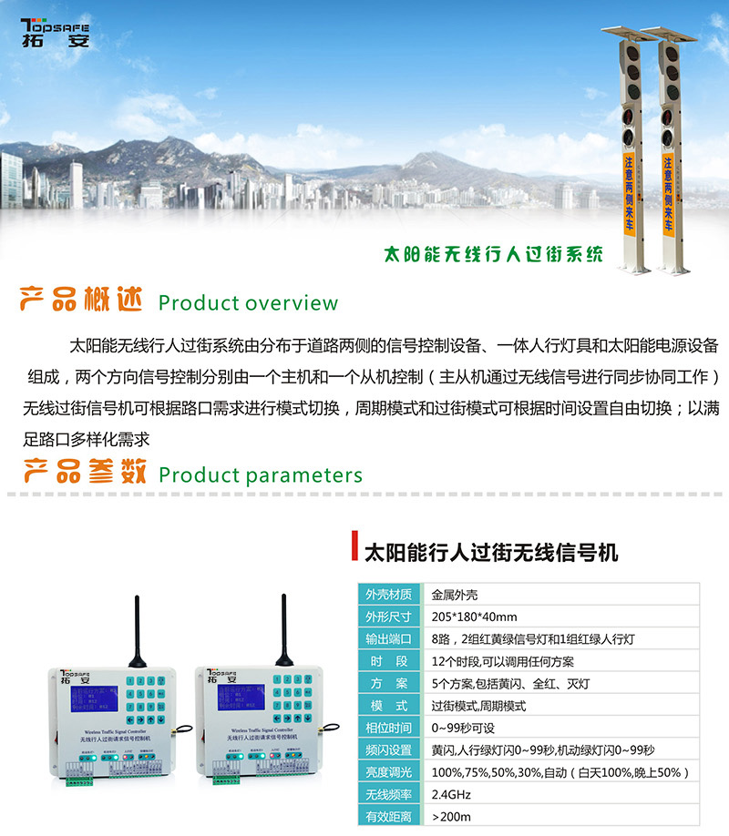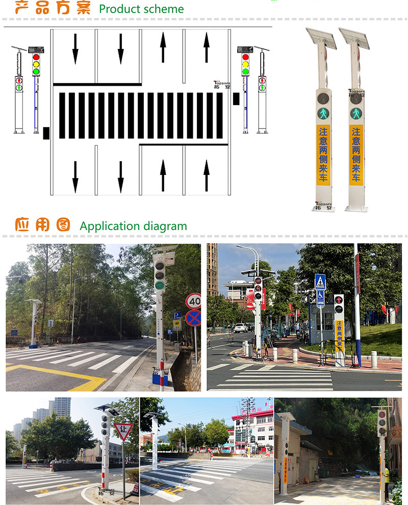 在一些常規(guī)的路段式的過街路口,行人過街呈現(xiàn)集中分段式特點(diǎn),一天當(dāng)中就那么幾個時 間段過街的行人比較多,平常時間很少人需要過馬路,在這種路口設(shè)置常規(guī)固定配時的信號控制器,反而降低了道路的通行率,在這種情況下,拓安推出行人過街系統(tǒng)方案(一體式人行燈),能有效的解決以上所述問題,提高車輛和行人的通行效率。
