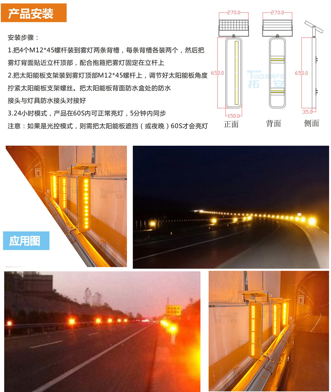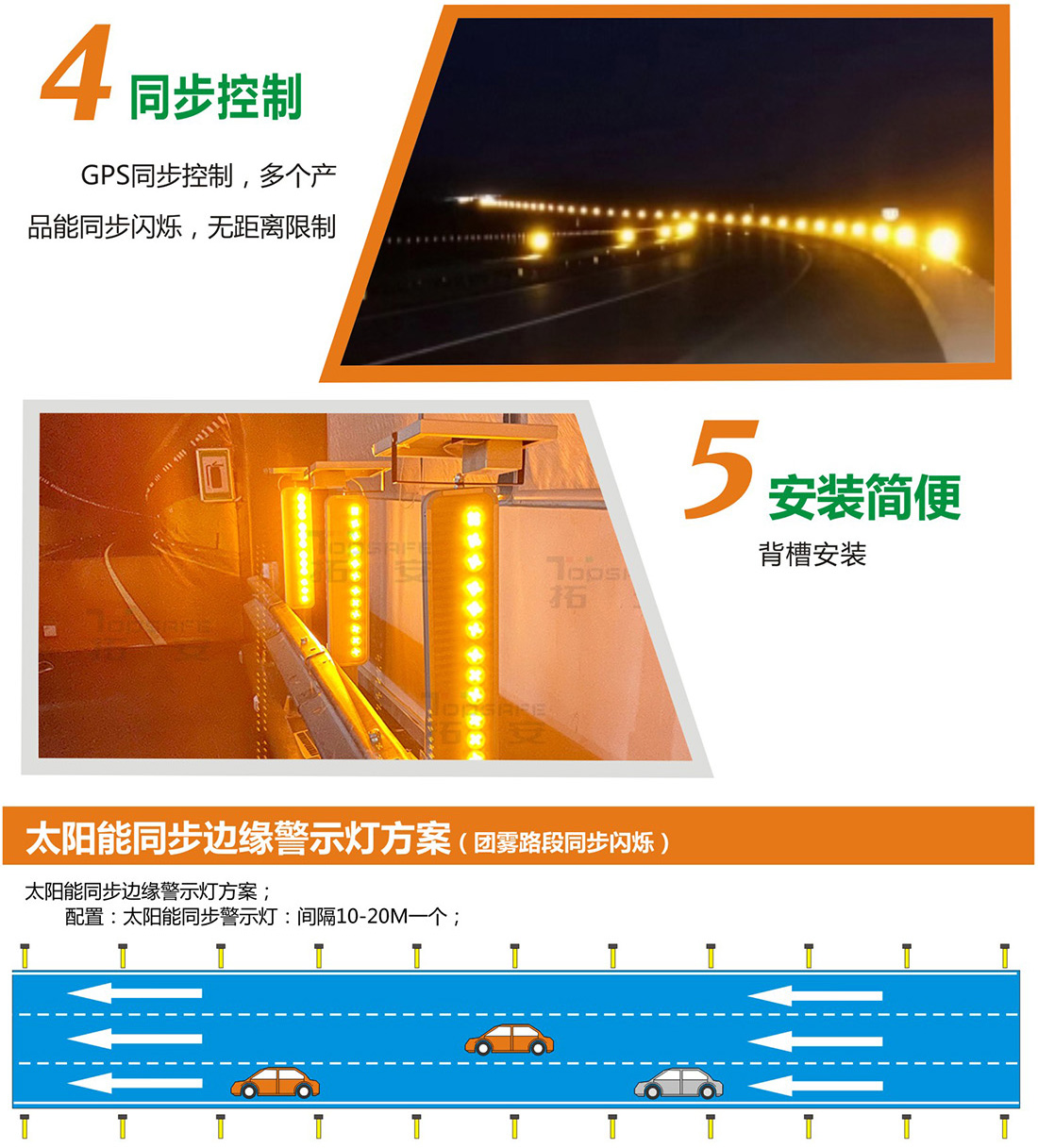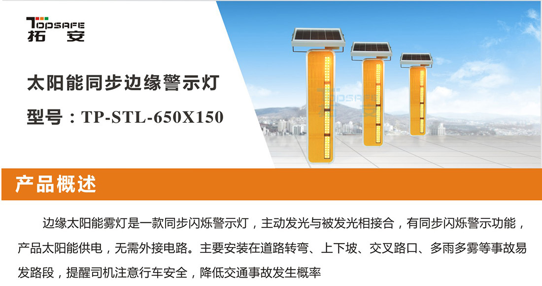 太陽能同步邊緣警示燈是一款同步閃爍警示燈,主動發(fā)光與被發(fā)光相接合,有同步閃爍警示功能,產(chǎn)品太陽能供電,無需外接電路。主要安裝在道路轉(zhuǎn)彎、上下坡、交叉路口、多雨多霧等事故易發(fā)路段,提醒司機注意行車安全,降低交通事故發(fā)生概率