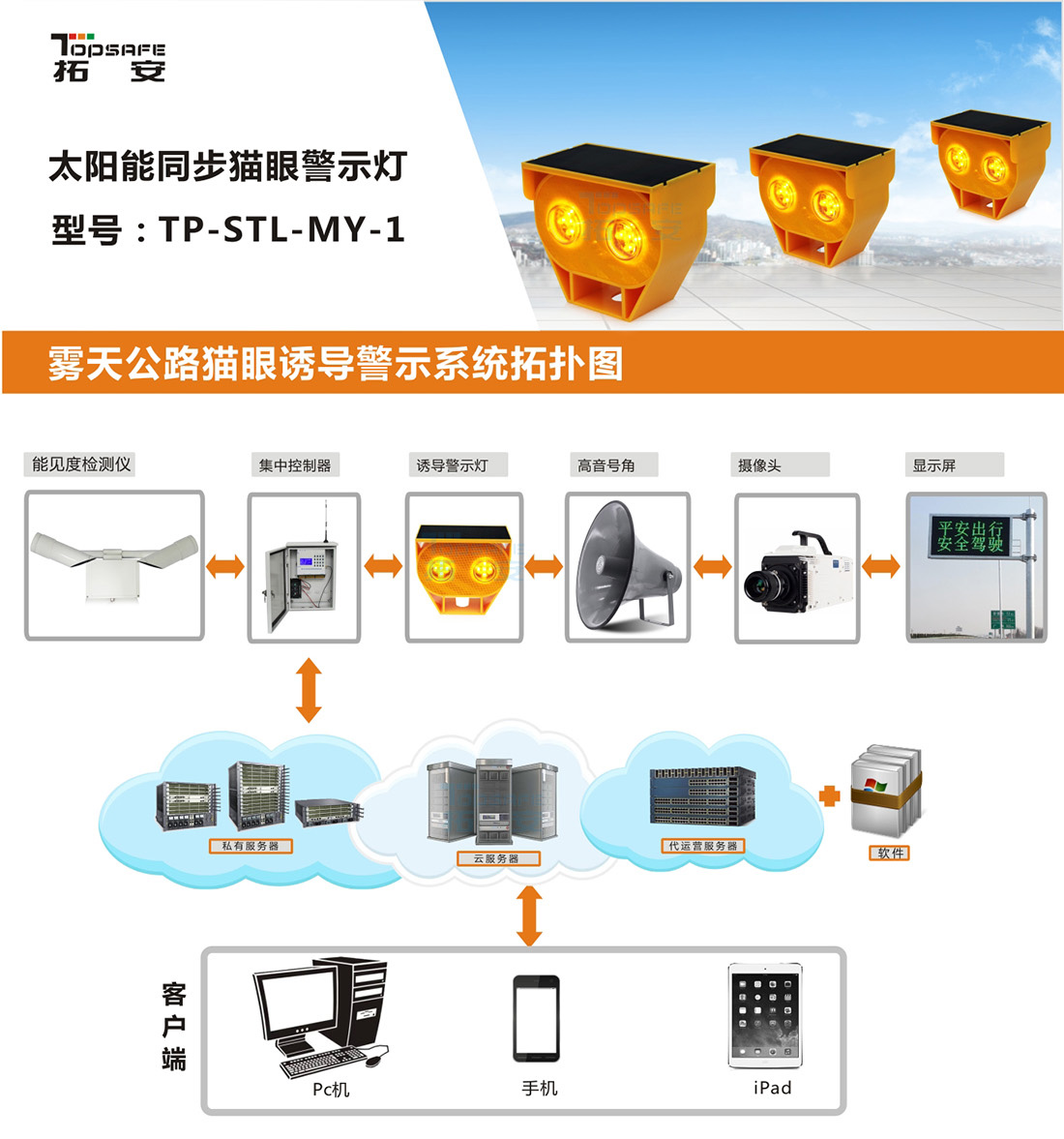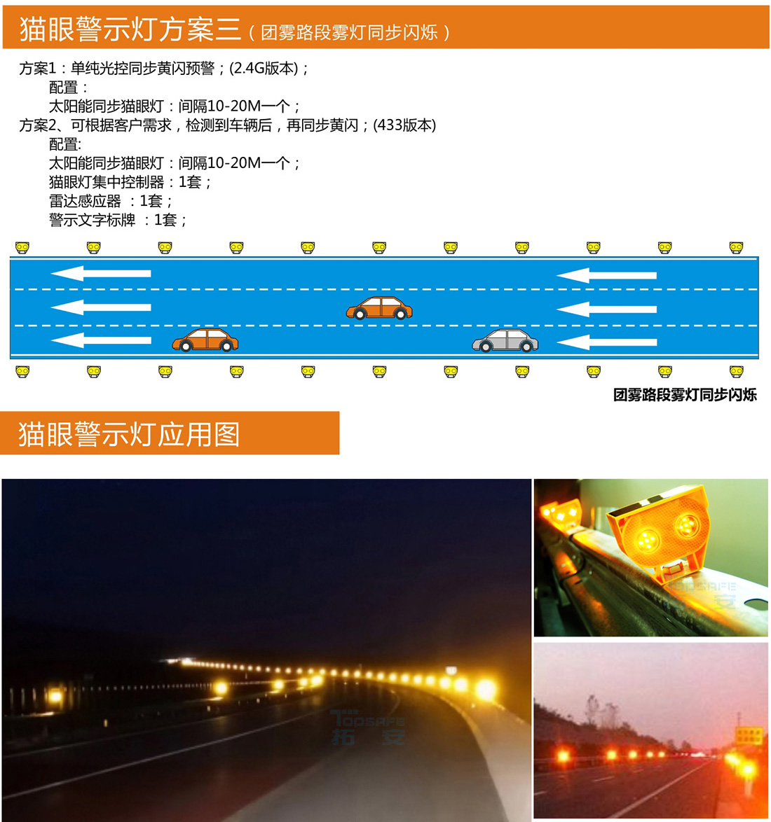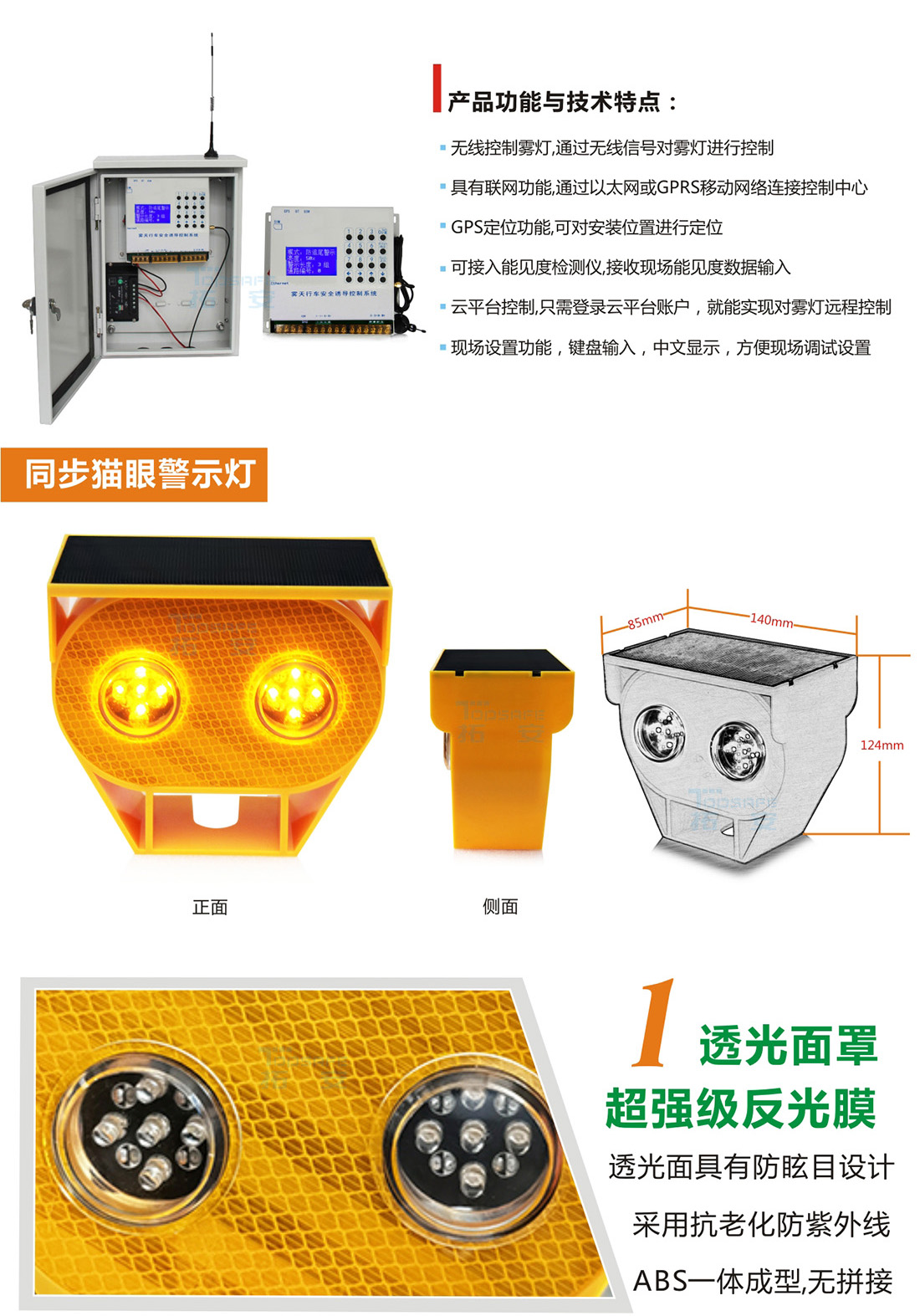 太陽能同步貓眼警示燈是一款同步閃爍警示燈,主動發(fā)光與被發(fā)光相接合,有同步閃爍警示功能,產(chǎn)品太陽能供電,無需外接電路。主要安裝在道路轉(zhuǎn)彎、上下坡、交叉路口、多雨多霧等事故易發(fā)路段,提醒司機注意行車安全,降低交通事故發(fā)生概率。