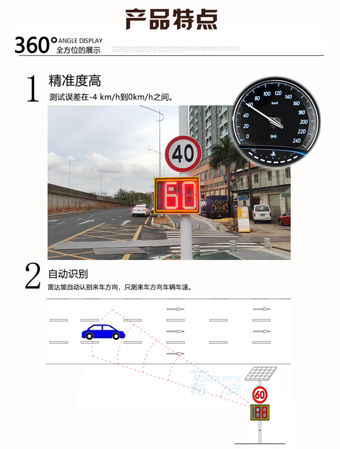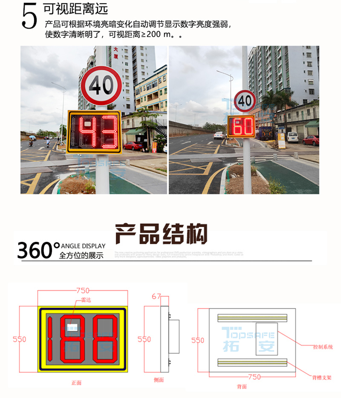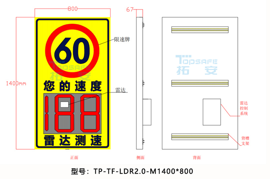 雷達(dá)測速反饋標(biāo)牌是基于雷達(dá)測速的電子設(shè)備,安裝于公路兩側(cè),當(dāng)車輛駛?cè)肜走_(dá)檢測區(qū)域時(大約在標(biāo)志牌正面0-200米范圍),雷達(dá)將自動檢測車輛行駛速度,并在顯示屏上用數(shù)字顯示出來。當(dāng)車速等于或大于設(shè)定的限定速度時,顯示屏顯示紅色數(shù)字,提醒駕駛員降低行駛速度,注意行車安全;當(dāng)車速小于設(shè)定的限定速度時,顯示屏顯示綠色數(shù)字,駕駛員可正常行駛。