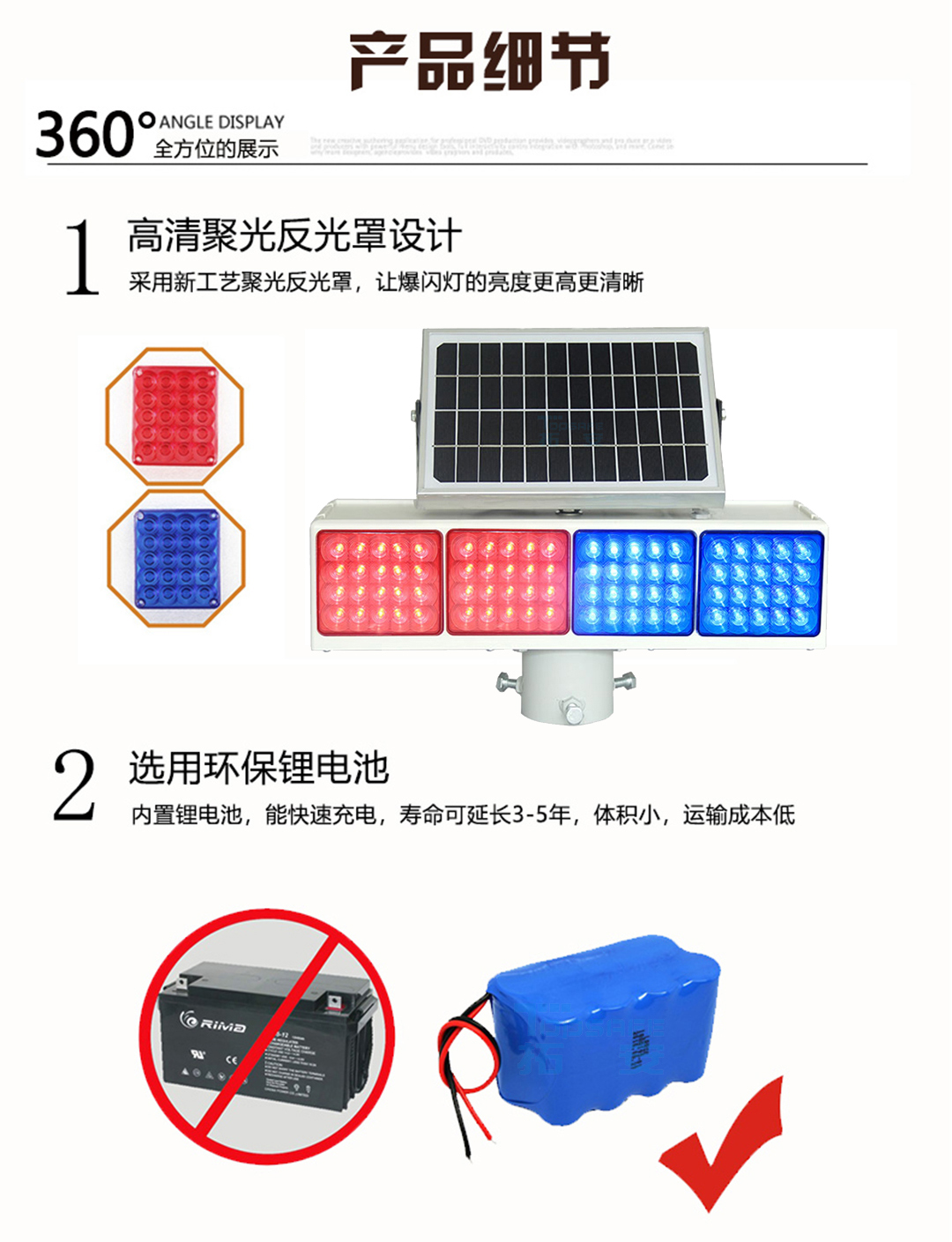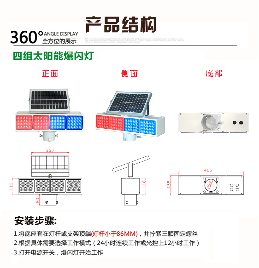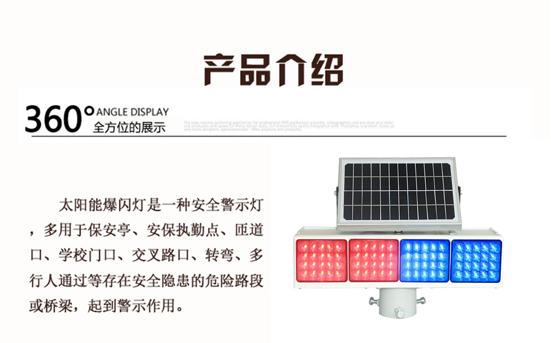 太陽能爆閃燈是一種安全閃爍警示燈,多用于保安亭、安保執(zhí)勤點(diǎn)、匝道口、學(xué)校門口、交叉路口、轉(zhuǎn)彎、多行人通過等存在安全隱患的危險路段或橋梁,起到警示作用。
