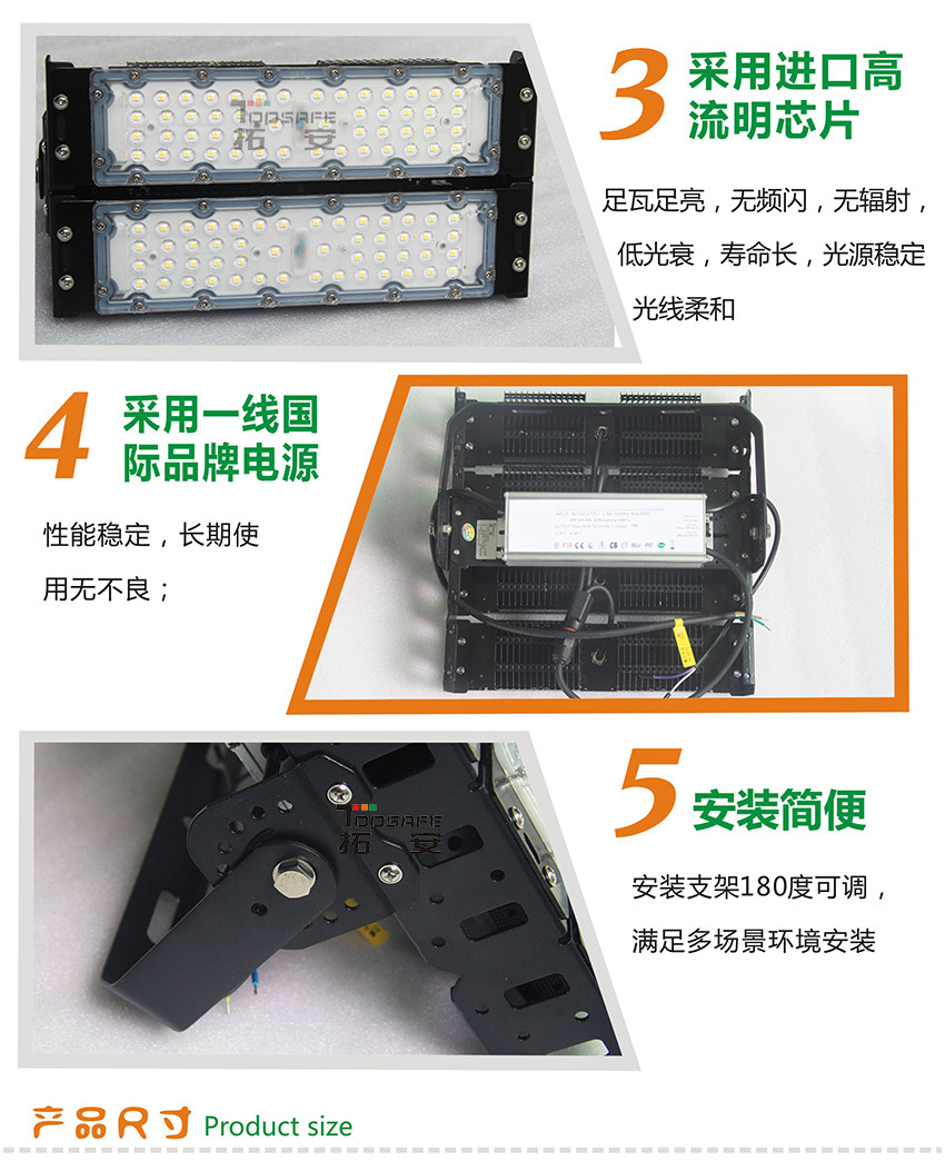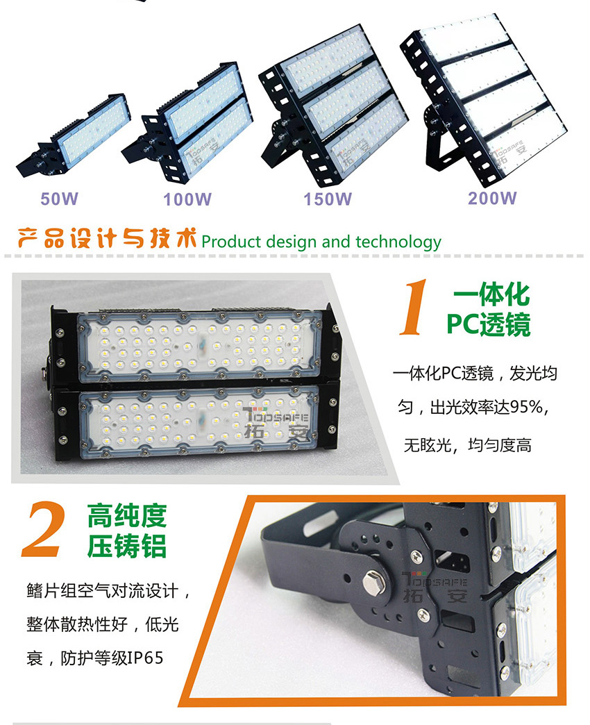 2、高純度全鋁材,鰭片組空氣對流設計,整體散熱性好,低光衰,防護等級IP65;