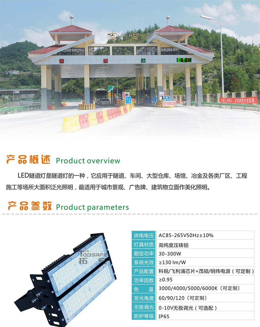 led隧道燈是隧道燈的一種,它應用于隧道、車間、大型倉庫、場館、冶金及各類廠區(qū)、工程施工等場所大面積泛光照明,最適用于城市景觀、廣告牌、建筑物立面作美化照明。隨著我國道路交通建設的迅速發(fā)展,公路隧道的建設規(guī)模及數(shù)量也越來越大,隧道照明也由此出現(xiàn)了如節(jié)能、安全等亟待解決的問題,隨著LED光源技術的日漸成熟,國內照明行業(yè)也開展了LED在公路隧道照明中應用的研究和應用實踐,因此,在隧道照明中結合先進的控制方式,采用高光效、穩(wěn)定性好、壽命長的新一代光源將會成為一種需求和趨勢