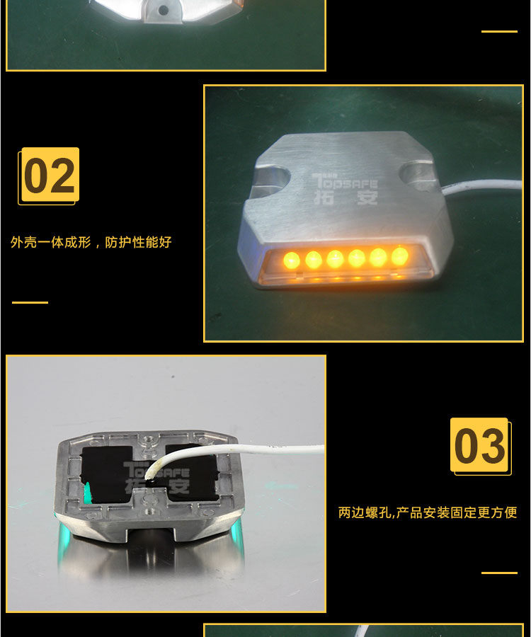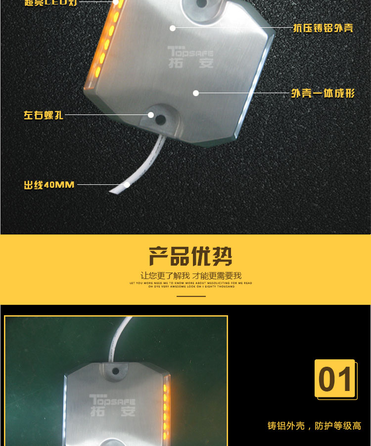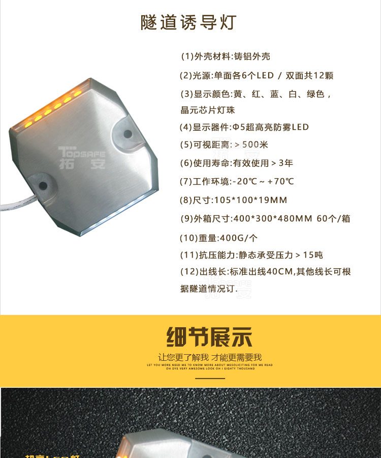 產(chǎn)品概述:誘導(dǎo)燈是一種主動發(fā)光的產(chǎn)品,在視線不良的環(huán)境下清晰勾勒道路輪廓,指示誘導(dǎo)安全通行,保障交通安全的指示標(biāo)志。