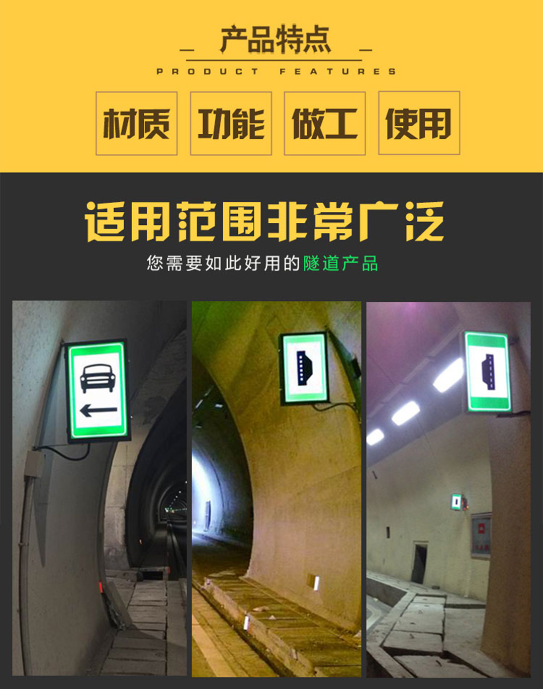 1.隧道電光標志采用LED發(fā)光技術(shù),是一種新型的隧道標志。用于隧道緊急狀態(tài)下提供道路信息(如指示道路方向,指示消防通道和設(shè)施等)起到疏散人群和車輛的作用,保障隧道安全通行,也可為隧道節(jié)省用電運營費用。