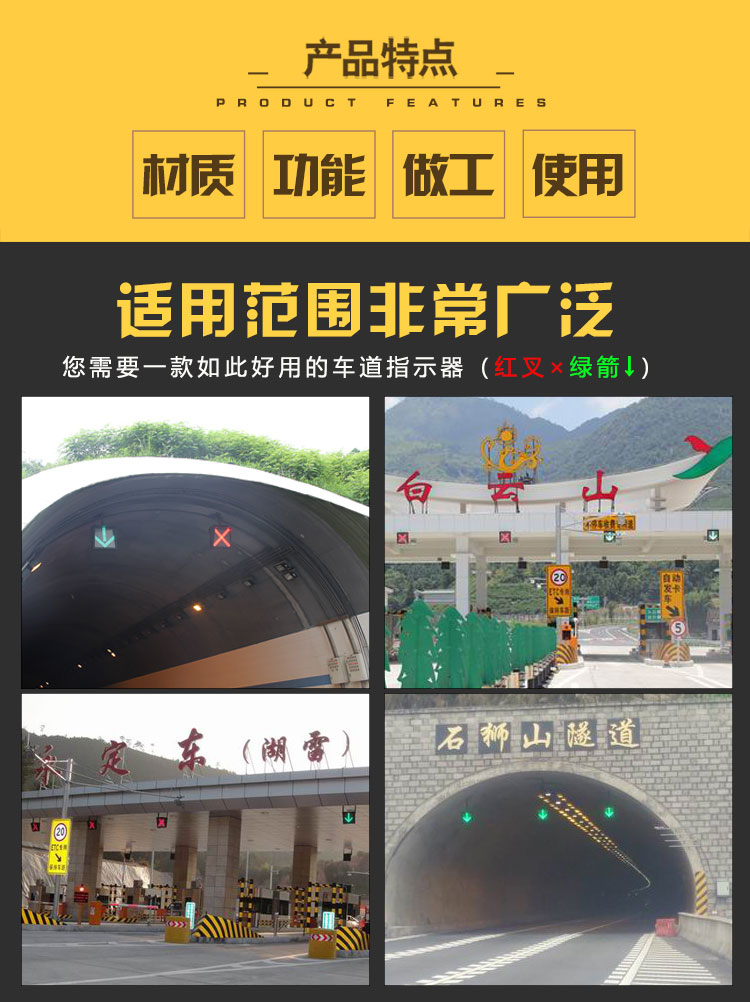 車道指示器常出現(xiàn)的在收費(fèi)站和隧道口,是一種交通指示燈,讓駕駛?cè)藛T能夠直觀的看到,提示本車道車輛按指使方向通行。對于交通的流暢度有很大的作用。