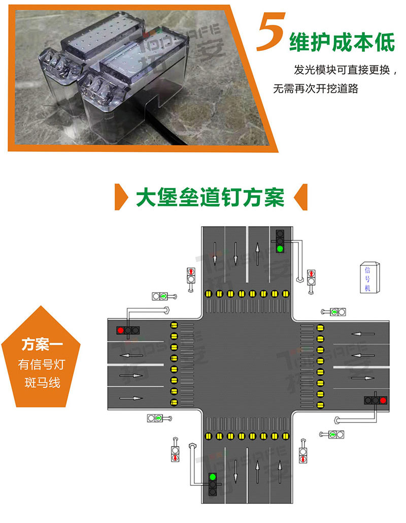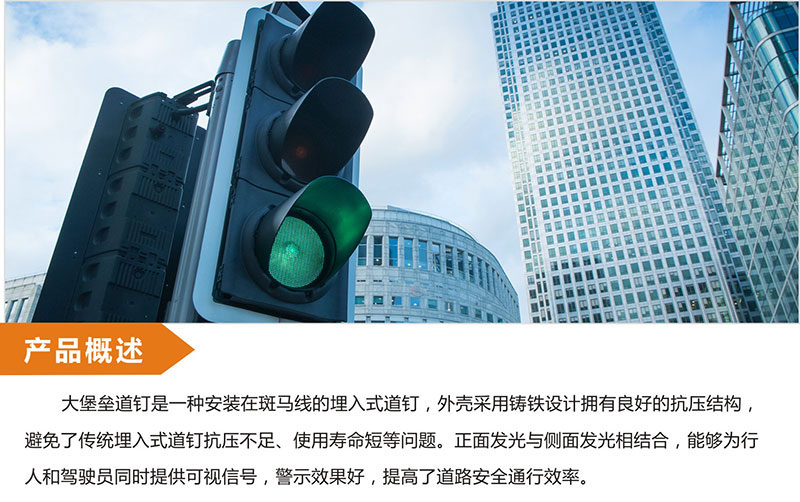 大堡壘道釘是一種安裝在斑馬線的埋入式道釘,外殼采用鑄鐵設計擁有良好的抗壓結構,避免了傳統(tǒng)埋入式道釘抗壓不足、使用壽命短等問題。正面發(fā)光與側面發(fā)光相結合,能夠為行人和駕駛員同時提供可視信號,警示效果好,提高了道路安全通行效率