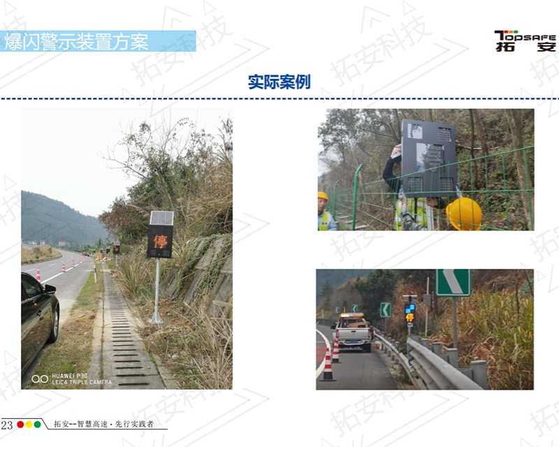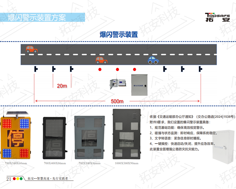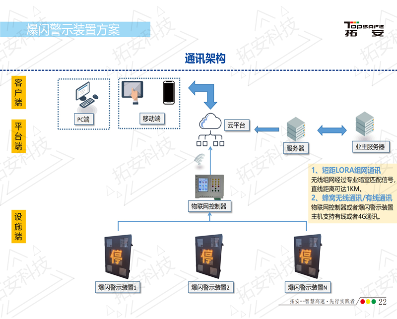 智能網(wǎng)聯(lián)爆閃警示裝置系統(tǒng)集成了遠(yuǎn)程控制、振動(dòng)傾斜檢測(cè)、電量檢測(cè)、事件和運(yùn)行狀態(tài)反饋等功能,是一種主機(jī)帶定位功能,從機(jī)短距組網(wǎng)無(wú)線同步閃爍的警示燈,多用于保安亭、安保執(zhí)勤點(diǎn)、匝道口、學(xué)校門(mén)口、交叉路口、轉(zhuǎn)彎、多行人通過(guò)等存在安全隱患的危險(xiǎn)路段,尤其是用于受山洪、泥石流、滑坡等災(zāi)害嚴(yán)重威脅的高速公路橋梁,實(shí)現(xiàn)了實(shí)時(shí)安全警示作用。